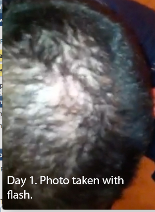 I took a picture on day 1 when I started using regular-strength Kirkland Minoxidil liquid, I was 33 years old when I started. After about 1 year, I switched to the 5% minoxidil liquid. I applied the minoxidil twice a day, 90% of the time (there were some stretches where I only applied it once a day, hence the 90% number).