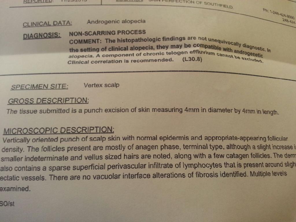 as I have talked about before, I have been experiencing fluctuating, high sheds since February 2015. This has resulted in a diffuse loss of approximately 40% of my hair. I was significantly iron deficient and had a slight hormonal imbalance (elevated total testosterone.) I have been supplementing iron, and although my total iron, hemoglobin, and hematocrit counts have increased and now seem to be in range, I'm still red blood cell deficient. I've also been on birth control pills and Spironolactone (for the hormonal imbalance, also hoping it would help with my hair) since late July. Still shedding heavily, no improvement at all. I finally had a scalp biopsy consisting of one 4mm punch. I would really appreciate any feedback. I know many of you know much more about hair loss than I do. Thanks.