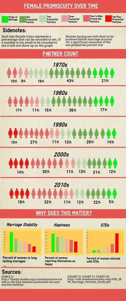 Let's not forget that half of the women in that graph still only fucked 3 guys by marriage, which actually, does surprise me a bit. And this is another cultural change here, those 5% that never fucked before marriage, are most definitely in a community that persists on it, these devoutly religious attitudes have of course dwindled dramatically in the last decades (and not just with consideration to official "Christians" now being Atheist, which is still considerable, but the amount of "Christians" now that do not let their religious identity get in the way of sex has certainly increased).