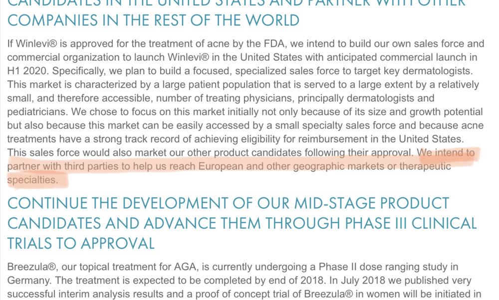 So probably they are looking for a bigger European pharma company as partner after their Winlevi launch in the US, that takes care of the EMA approval. Maybe it‘s going to be cosmo, their parent company. And maybe once they have their partner after Winlevi, that partner intends to launch Breezula at the same time as in the US. I dont think they will lose too much time, as the European market is the potentially bigger market.