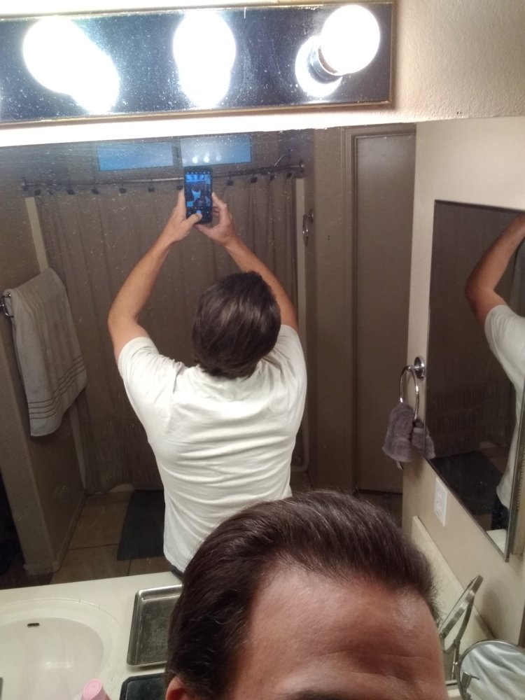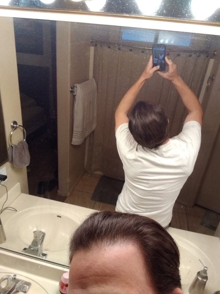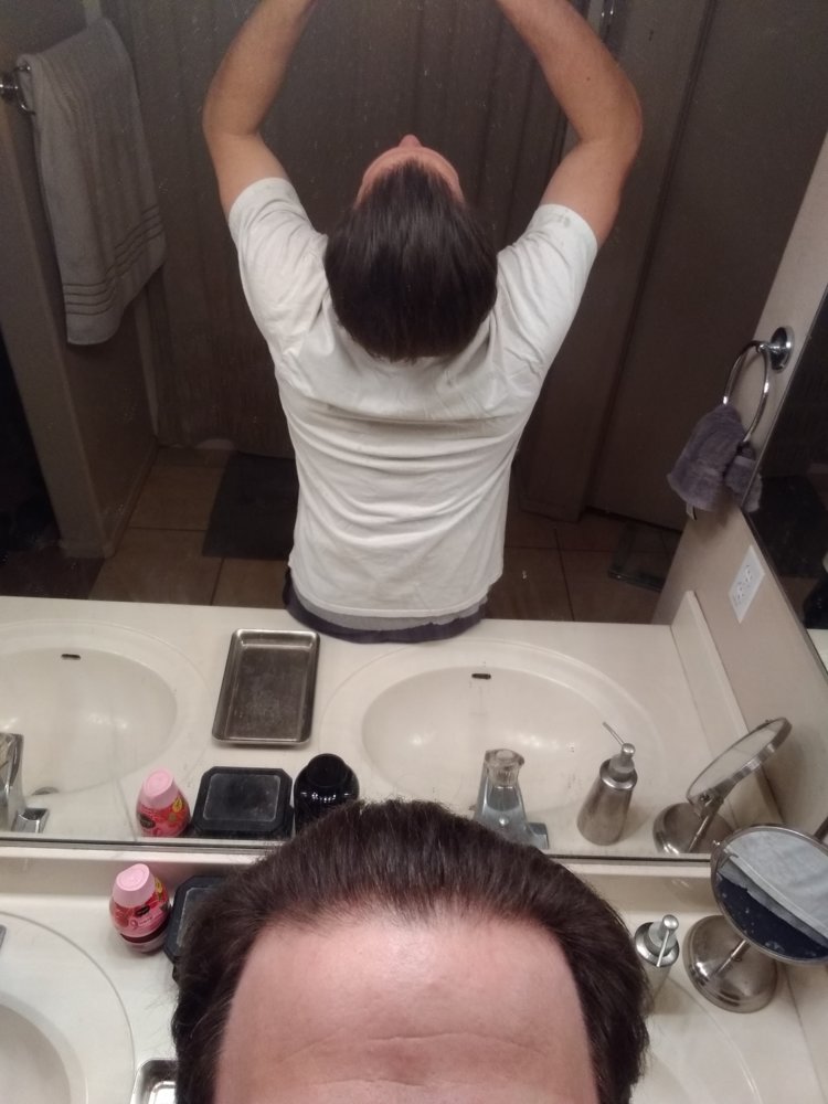 So same old style pictures with the harsh bathroom lighting, after minoxidil dries, nothing else in my hair. Front and both sides this time.