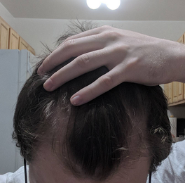 All these pictures were taken in the same room in the same spot, so I tried to get the same angle and lighting. This is a photo of my hair from the front, dry and with no product. I'd have to dig to find something to compare it to, but it's a huge improvement from December of 2017 when I was getting close to NW3. Right now I'd describe myself as a NW2, but on r/tressless I was told I'm a NW1.