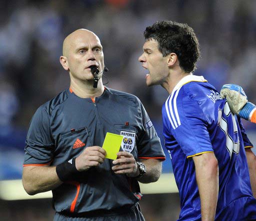 Ballack gets a yellow card for thinning on top. Ballack didn't agree. The referee has a lot of experience though.