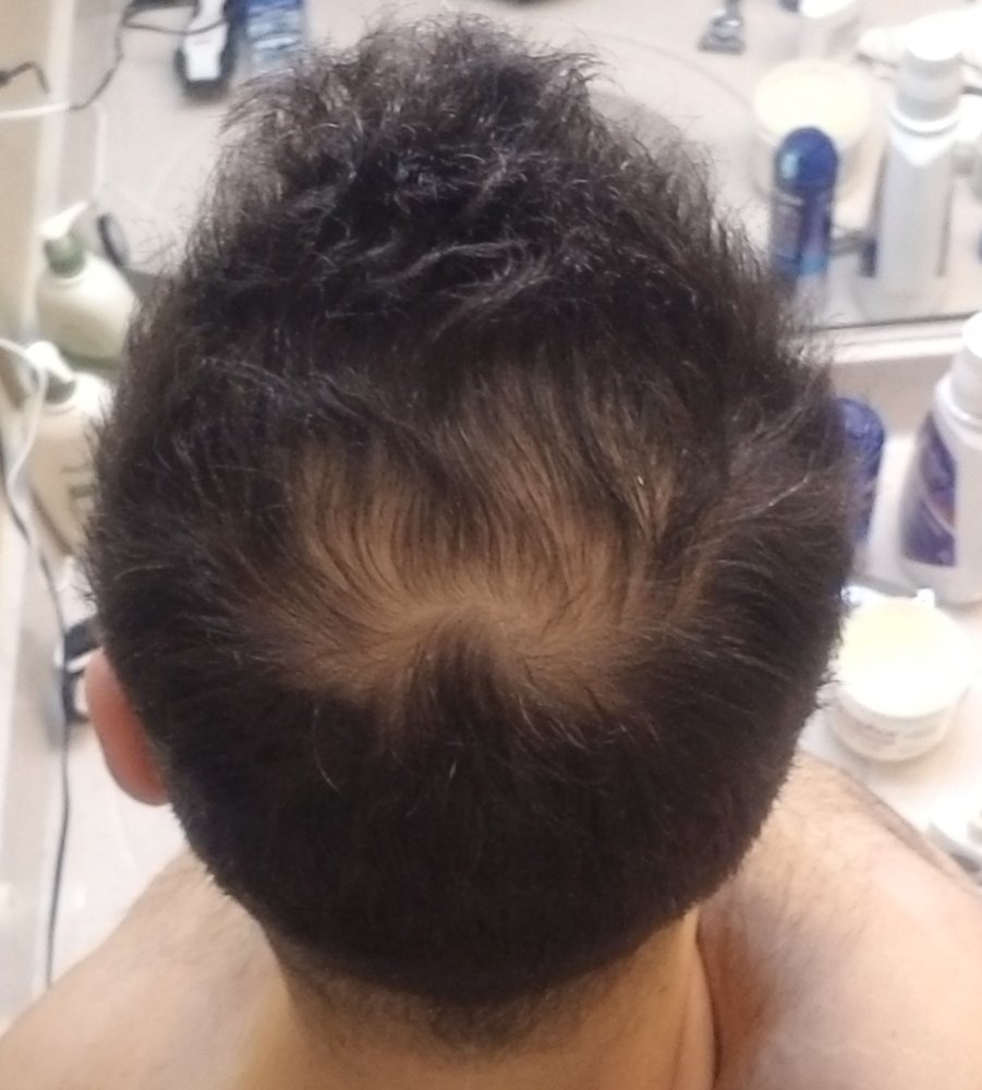 these pics are done to focus on how horrible the crown looks. My hairline is like a NW1.5. If I blowdry it and put some gel in it, most people don't even think I'm balding (the waviness helps a lot)