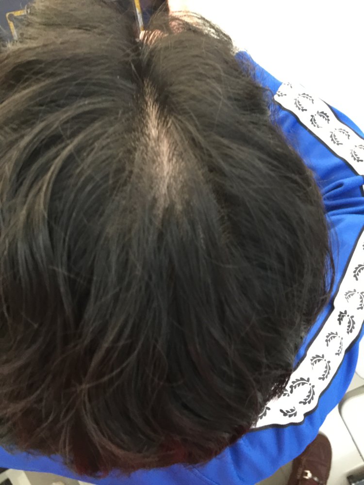 Hello! I am 16 years old and my scalp seems to be very visible from the top. My hair is long and wavy, like my mom's. My dad is borderline balding (still has a pretty significant amount for a 53 yr old but thinning is definitely present) and my mother's immediate male relatives have not experienced any sign of male pattern baldness. Attached are pictures from last week (white shirt) and pictures taken today (blue jacket). I think it has gotten pretty bad, and when asked, my classmates agreed. I take great care of my hair, and I am very much afraid of losing it.