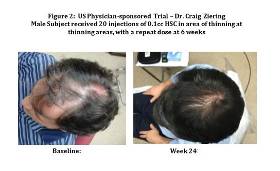 "In summary, clinical data to date shows that HSC has benefits that other products do not offer – hair growth appearing to be permanent 2 years after tests, temporal recession restoration, effectiveness in men over 40, and efficacy in female patients. HSC offers the potential as a standalone alternative treatment option or an opportunity to be given in conjunction with other treatments or products. It has the potential to improve results as a follow on treatment to hair restoration surgeries, offer an option to patients who are not candidates for surgery, and to be a more effective option for those presently using or considering Rogaine or Propecia."
