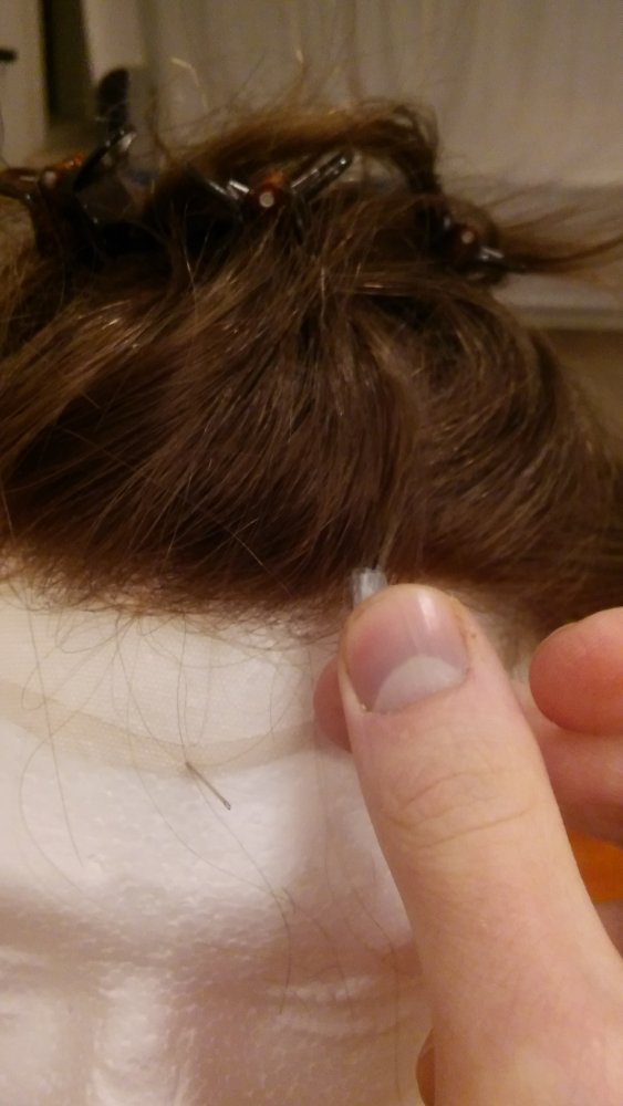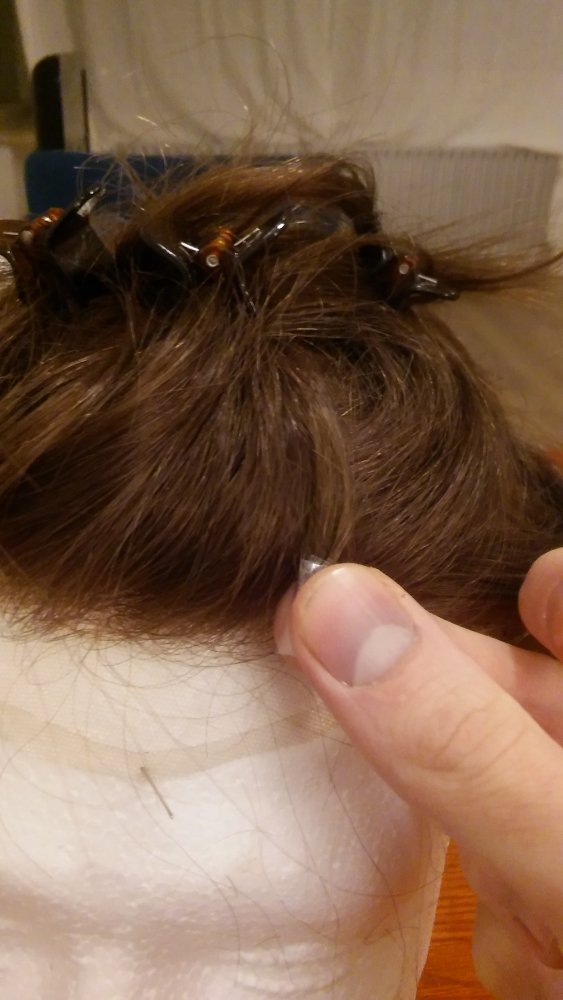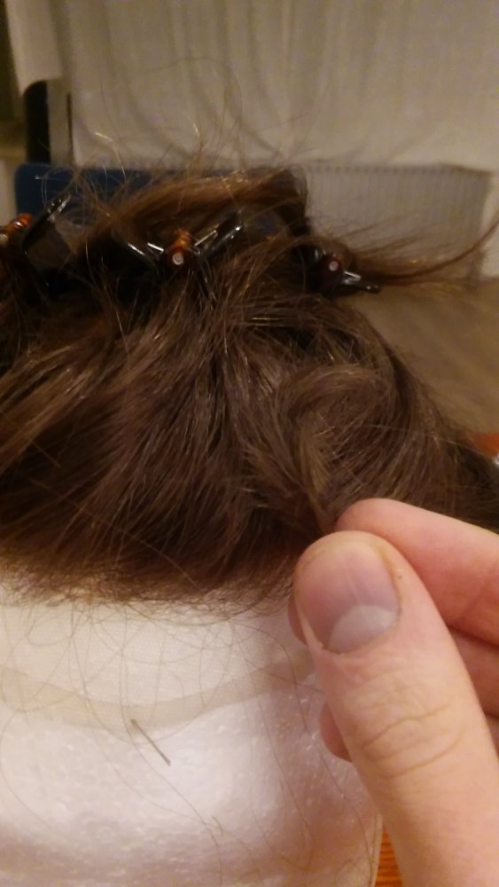 I'm confused. When i hold the hair system next to my head, or just look at it, it seems one or two shades too dark to me. But then when i cut a hair sample of my own hair and hold it next to it, it seems like an almost perfect match..(see pics, i'm holding my own hair sample against the hair system in all 3 of the pics) how is this possible?? I'm having it cut-in at a salon next weekend