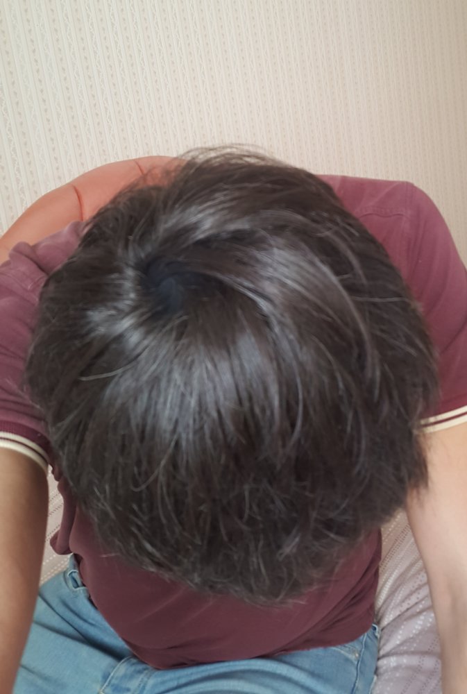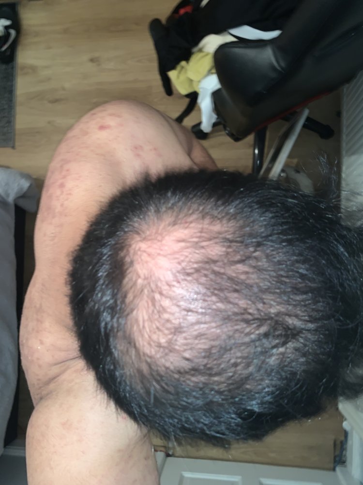 I'm going to try and use a little less.. the technique I tend to use is part the middle and also 1 either side and apply. Then touch up the crown as well as some on the sides where it's thin.. the blue tint I was mentioning is in the photo I've attached..