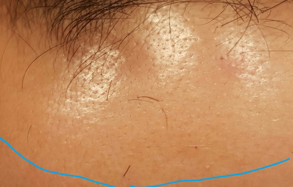 Been on finasteride/min/keto/biotin/sulfate-free shampoo for 5 weeks. "Hairline" shown in blue. Be sure to zoom in.