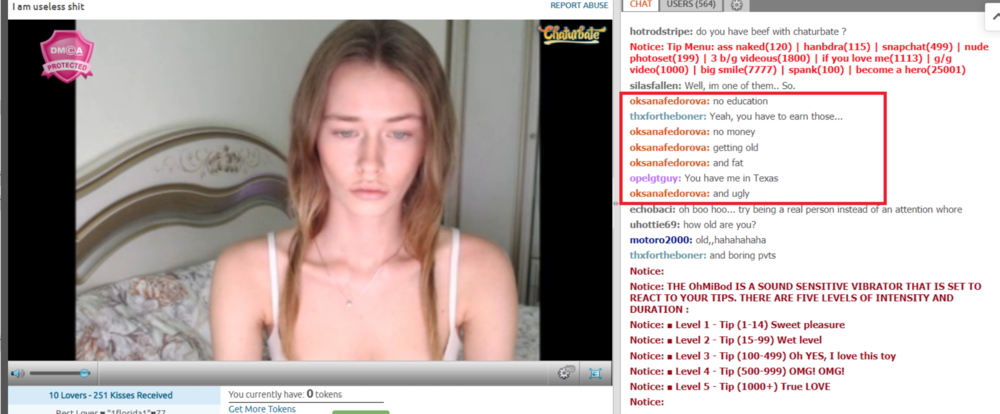 I like the fact that it didn't work, I would think some of the chaturbate viewers would whiteknight her and feed her money for talking like that.