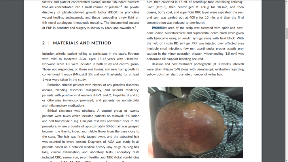 Noisette and all, the dermarolling with prp study (non minoxidil) doesn't break down the steps. Can anyone assist? For example, is the scalp dermarolled then injected with prp? Is the scalp injected with prp then dernarolled? Is the scalp simply dermarolled with prp (not injected)? Thanks all! I understand prp is used twice a month for 6 months (which a lot) but don't know the finer details.