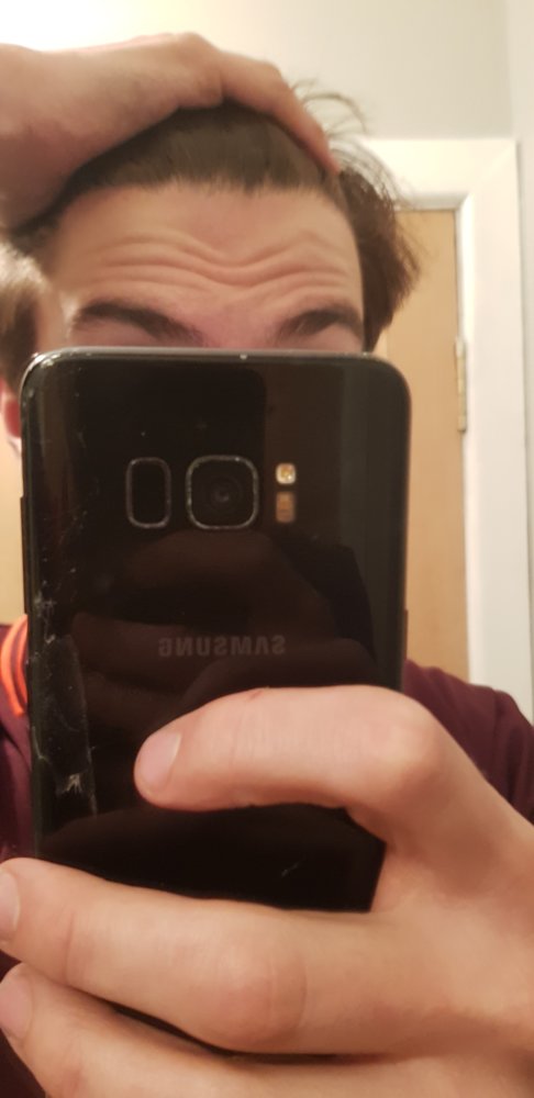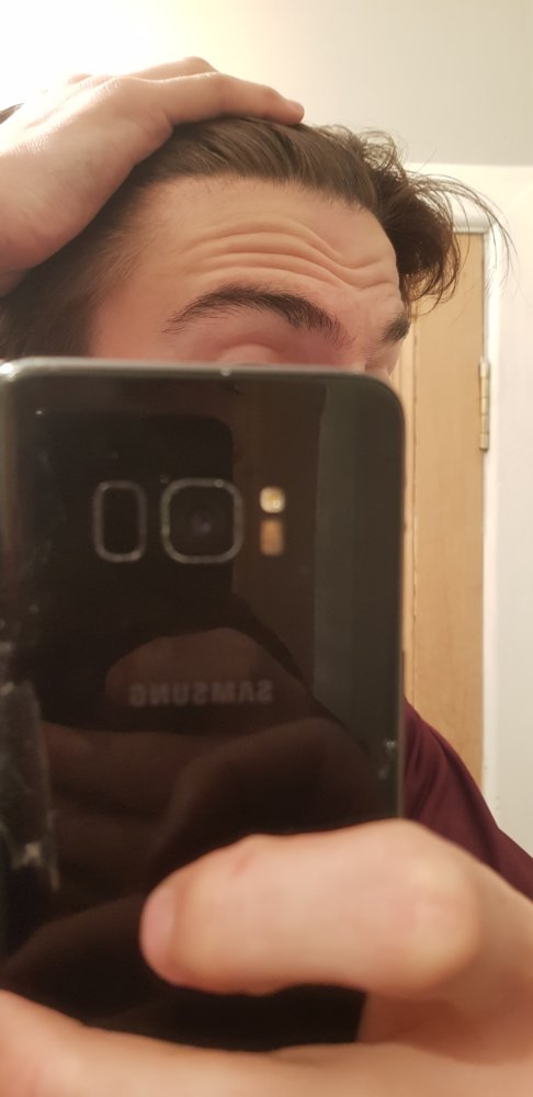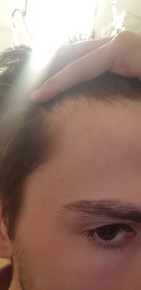 I'm 22 and have become aware of some (?) hairline recession, particularly at the temples. I also feel that my hair has become less dense; however, I am not 100% sure as I experience very little shedding.