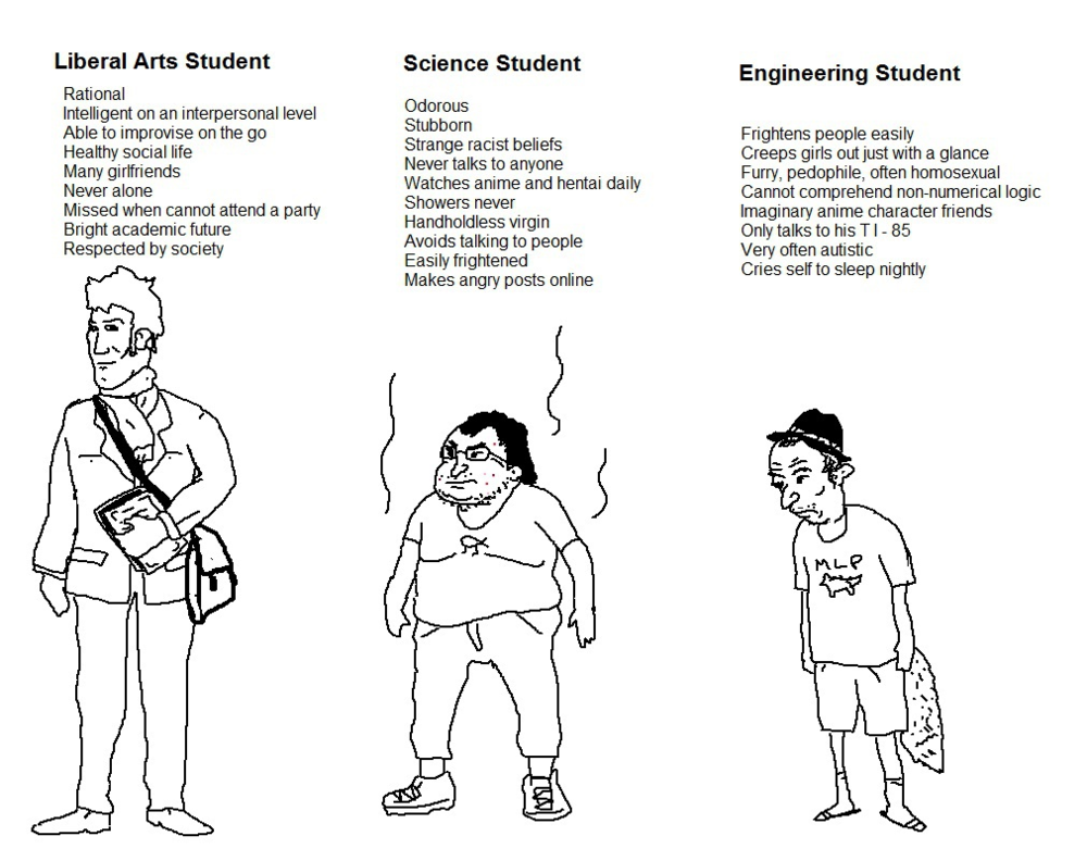 Our law library was mixed with the arts library and I spent most of my time there - but whenever I went to the science and tech library I was always shocked in how much worse they dressed and how many more men over women there were.