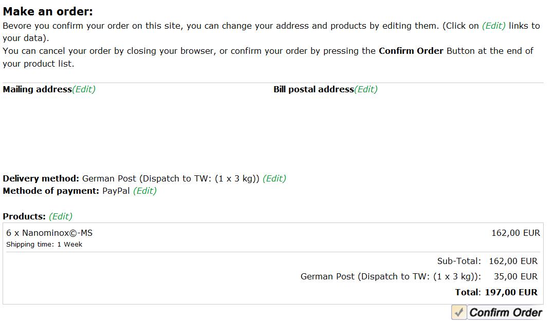 I'm trying to order over Eur 150 but they charge me EUR 35 for shippingknowingyou said:@RESAP-- The Nanominox FMS is 35,50 Euros per 100ml. I hope it help.