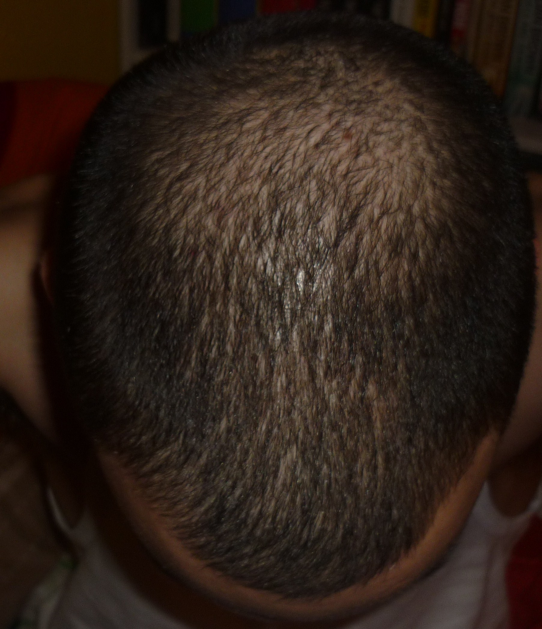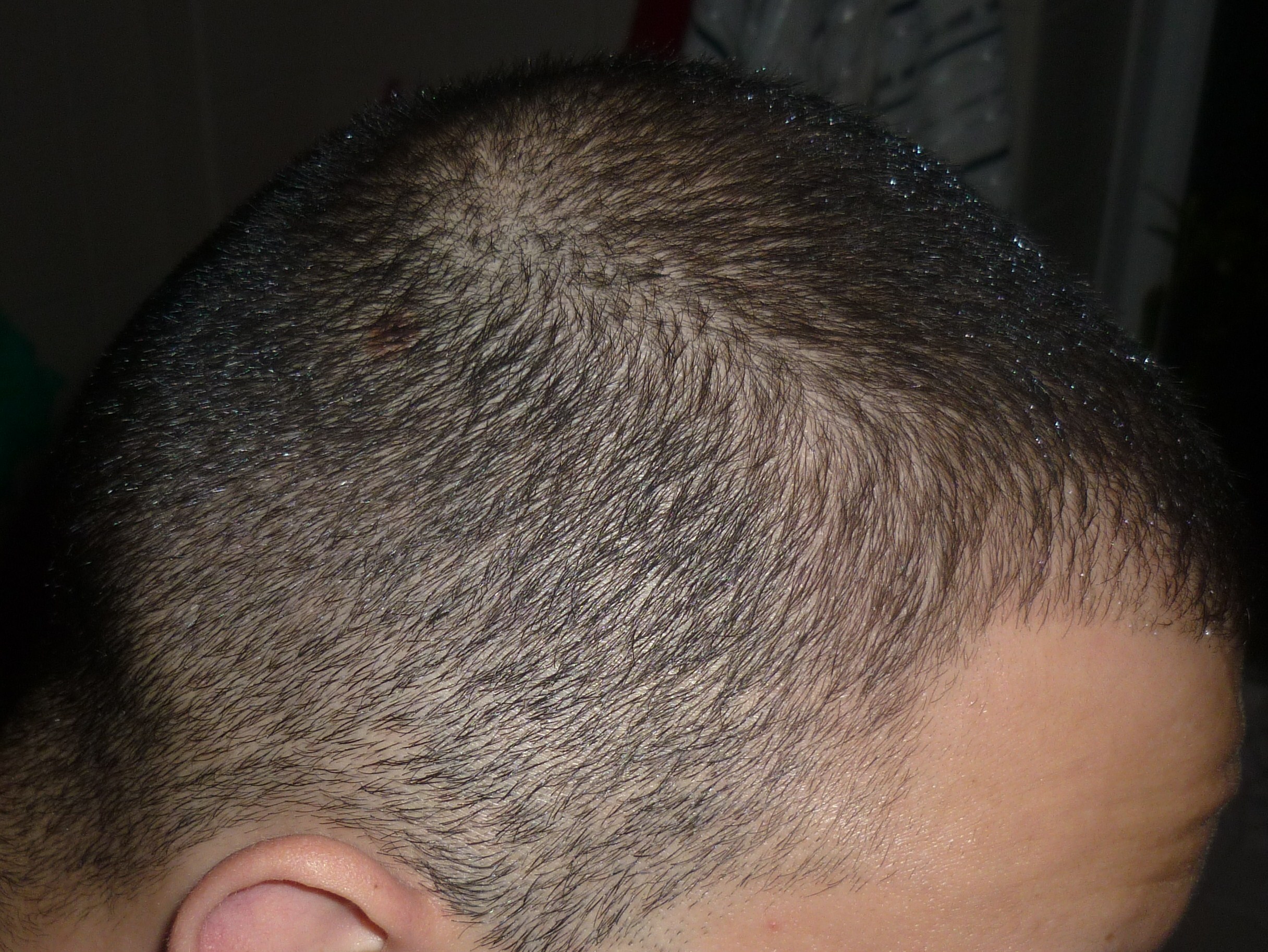Anyway, eventually I realised I was thinning on my crown too, however I mean extreme thinning, out of nowhere really, a large circular area around my ccrown has thinned so much that I got a grade 2 buzzcut and under a light it looks like im basically a monk...I dont get how this happened, I never see hairs fall out on my pillow or in the shower or anything. Im starting to notice that in general my hair is growing kind of patchy, like some areas would be thicker than others. My normal haircut is a number 2 on the top fading to a 0 on the sides and back (bald fade) however the hairs are growing back weird and patchy in some areas and my crown is going insanely thin. I ve started using mino on my crown for about 2months now seriously, and cant really report any seriousss results though some parts of my crown are definately getting thicker than others, but its still patchy, its not growing back evenly.
