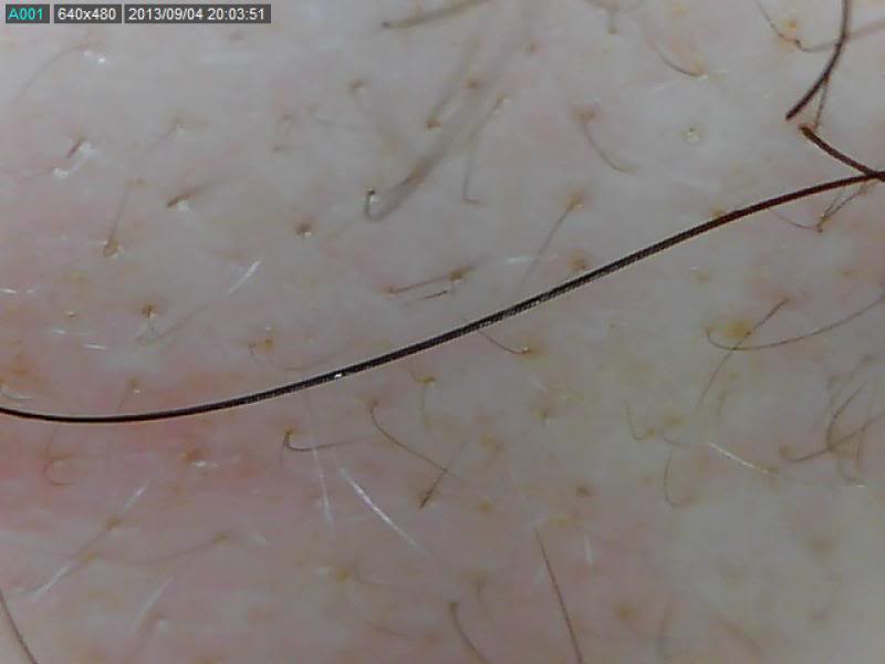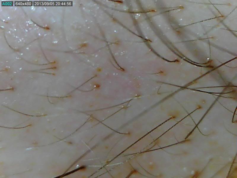 hahaahaha! OK for all the non-believers here.. I am on week 5 on rollin. I a have a receding hairline..not vertex balding...Here's what my temples look like both side.. Just took a snap-shot with my Dino-Lite...
