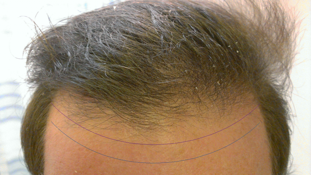 Blue line highlight juvenile hairline, Pink line highlight receding hairline. Notice like some hairs are sprouting randomly in areas where I didn't have visible hair. Also, maybe it's difficult to see in this picture (phone = bad quality), notice several black dots along my receding hairline, hopefully it's new hair coming out. The white crap in my hair is dead skin, I started to peel today