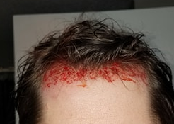It looks worse than it is. I just quickly dab over and over until it finally draws blood. The first few pokes don't make it bleed at all. I do this to be thorough. Not because its necessarily critical to go this far. In these pictures you can also see the erythema associated with micro needling after the blood is removed. This lasts probably a day or two after you micro-needle yourself—and I have a skin condition that makes me react worse than most people so its fine. You can see where I am setting my new hairline, so if the results coincide with this line then you know why it happened. I do this fresh out of the shower so my head is soaking wet and opened up some and clean. So it also looks worse because of all of the water mixed in.