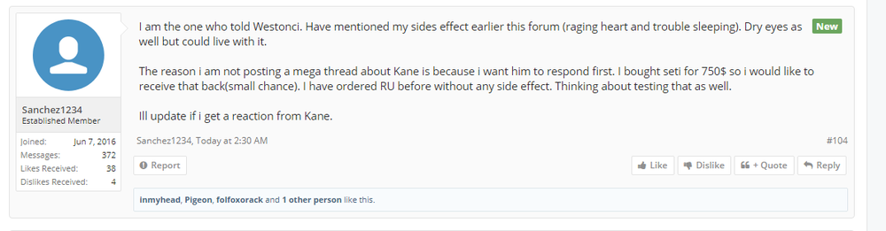 The reason i am not posting a mega thread about Kane is because i want him to respond first. I bought seti for 750$ so i would like to receive that back(small chance). I have ordered RU before without any side effect. Thinking about testing that as well.