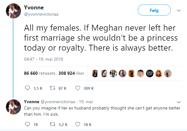 Royalty is held to a higher standard than regular people, and royals should act accordingly. Royals are being looked up to as role models by many and represent their country. And I don't think it's a good thing for society that a degenerate is marrying their role model and representative and thus becoming one herself. In your second paragraph you are conceding to this point, you just have a different standard of what's too degenerate for royalty. This Twitter post is an example of what this marriage promotes, notice the likes and retweets. This marriage is normalizing or even encouraging divorce and branch swinging.I'm doing well, thank you.