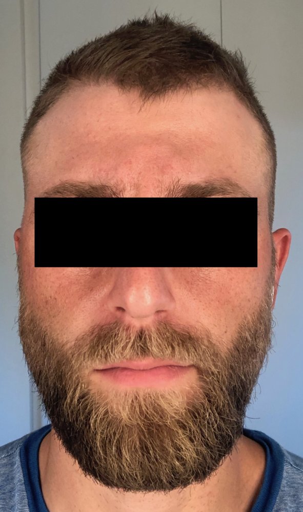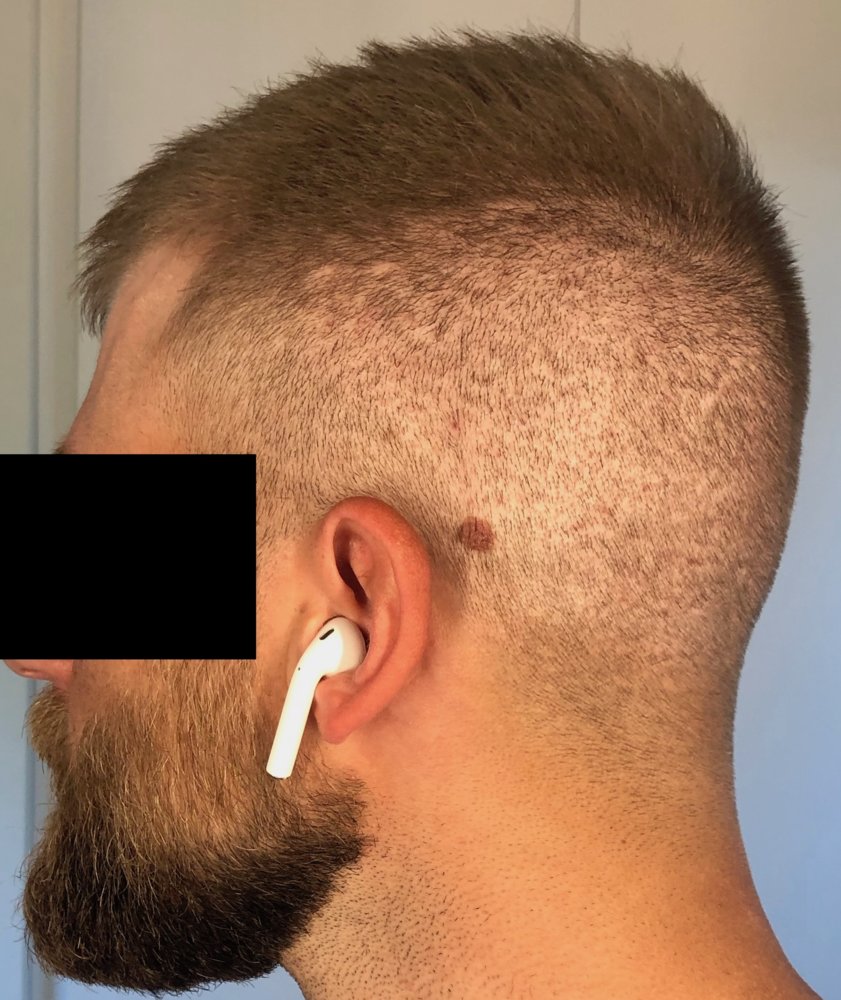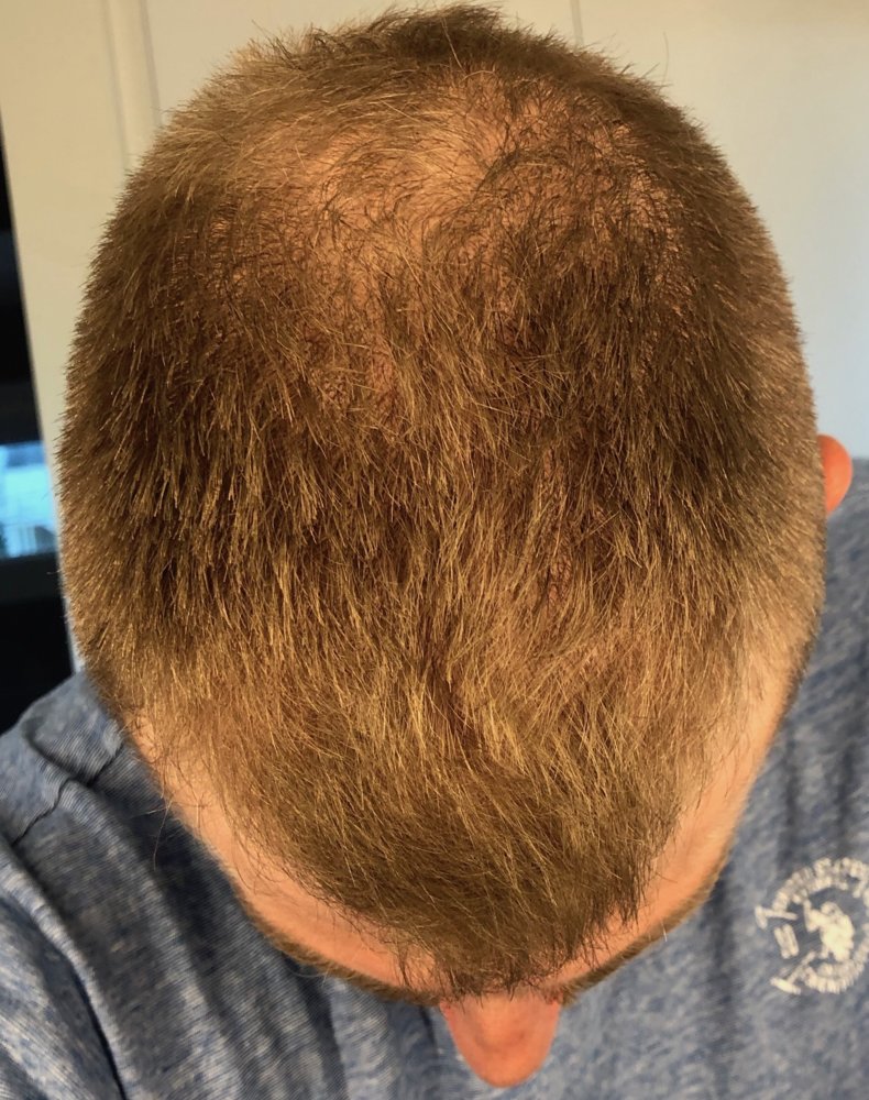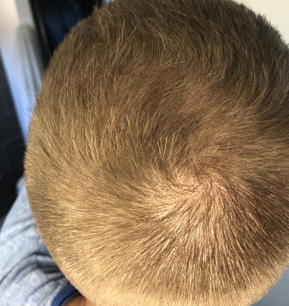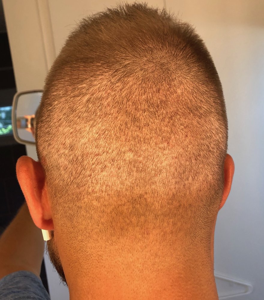 Nothing new to report. Got a haircut yesterday. Looking forward to the new growth that's supposed to start in about 3 weeks. I took the photos in the same place as usual, but a little later in the day, so the lighting looks a little more golden (even though the same lights are on as in the others).