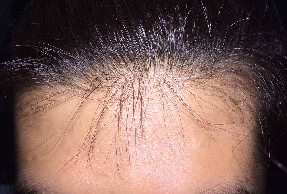 This is what I mean, here's a picture. See those shorter hairs in the front? along the outline of the hairline? Can't tell if that's hair on its way in or out.
