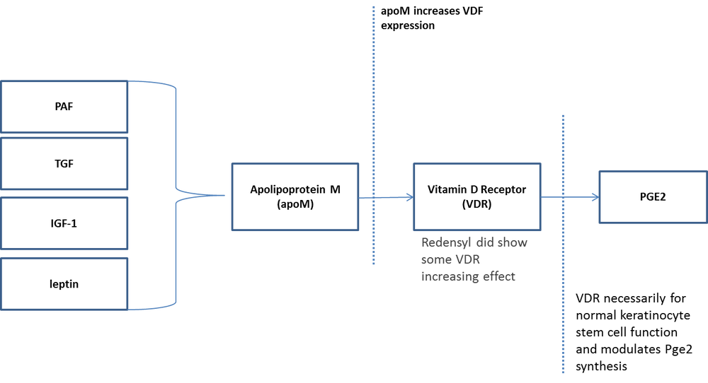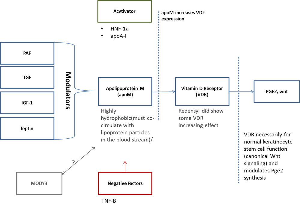 This is the point where it got me really, apoM expression can happen according to a paper through IGF-1(!), TGF(!), PAF and leptin. I read a lot of IGF-1 and TGF regarding hair growth. However this is the first time I heard that it was connected to vitamin D. (https://www.ncbi.nlm.nih.gov/pmc/articles/PMC523857/)