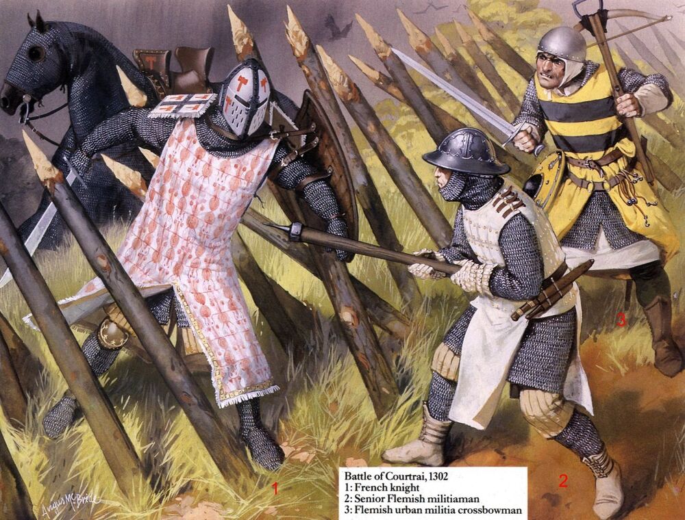 During the Battle of the Golden Spurs in 1302 the G*rmanoid Flemids were able to pin down the French cavalry through their Goedendag troops working in conjunction with pike troops and subsequently wipe them out basically to a single Frogoid Romaboo.