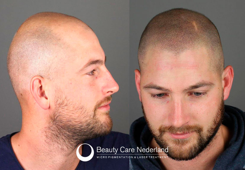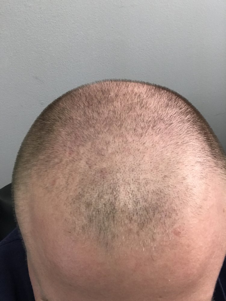 You could get SMP ( Scalp Micro Pigmentation ) that would give you the illusion of a full head of hair but as if you are choosing to shave. Here is an example.Well there's the answer, haha! For some reason it seems like there's such a huge difference between those two things, but I guess that's all mental