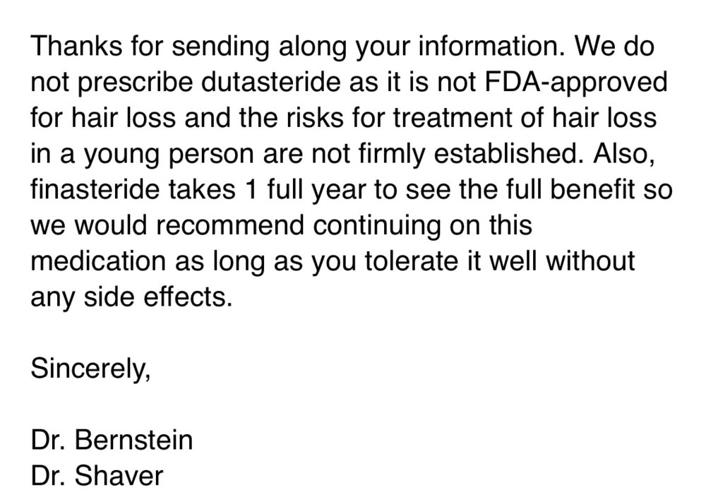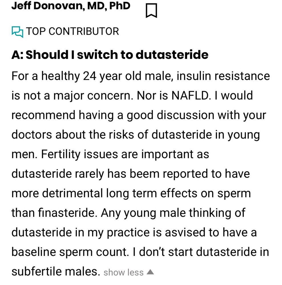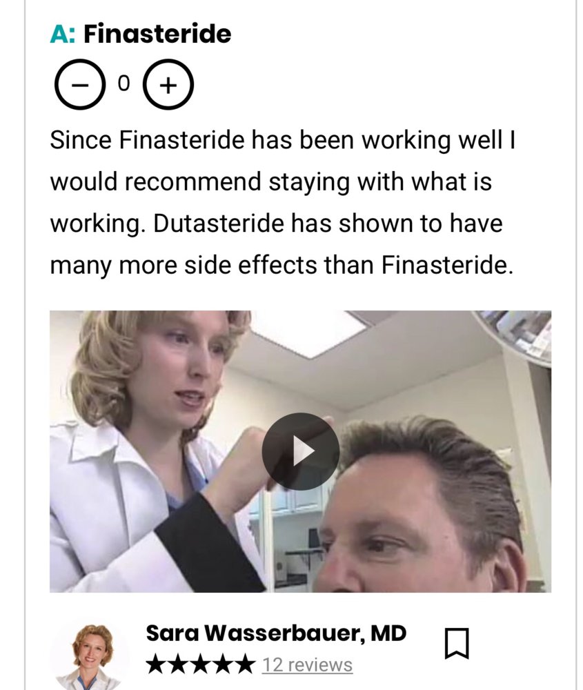 Na dude. finasteride should be sufficient untill you give it a year to see. Duta is much heavier anti androgen.So no dutasteride yet? I’m just thinking I waited a long time to get on finasteride. Don’t wanna make the same mistake with dutasteride...
