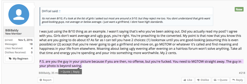 Hi @Admin or any other moderator, @DHTcel has been harassing me on private messages and is no telling lies about the nature of my posts. I've had a few pops at him, it's true, but nothing out of the ordinary with the stuff posted by many other users of the forum. As to his claim that I have not given him advice or telling him how to improve himself, this is a flat untruth. I quite clearly advised him several times to, if he really is as ugly as he claims, stop worrying about his appearance and pursuing relationships and devote his attentions elsewhere e g. To a career or hobbies. As far as I'm aware, he is only tagging you in his post because, in response to this weird '1 dislike from you = 6 dislikes from me' PM he just randomly sent me, I said that I was going to report him. Which I would like to, for threatening/harassing me over PM.