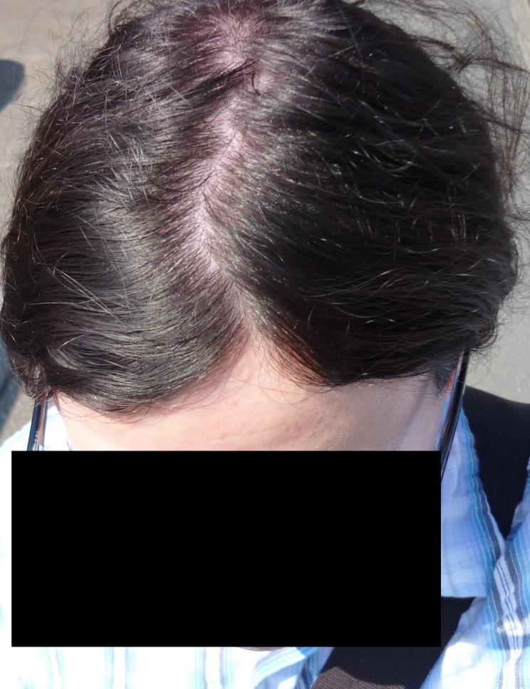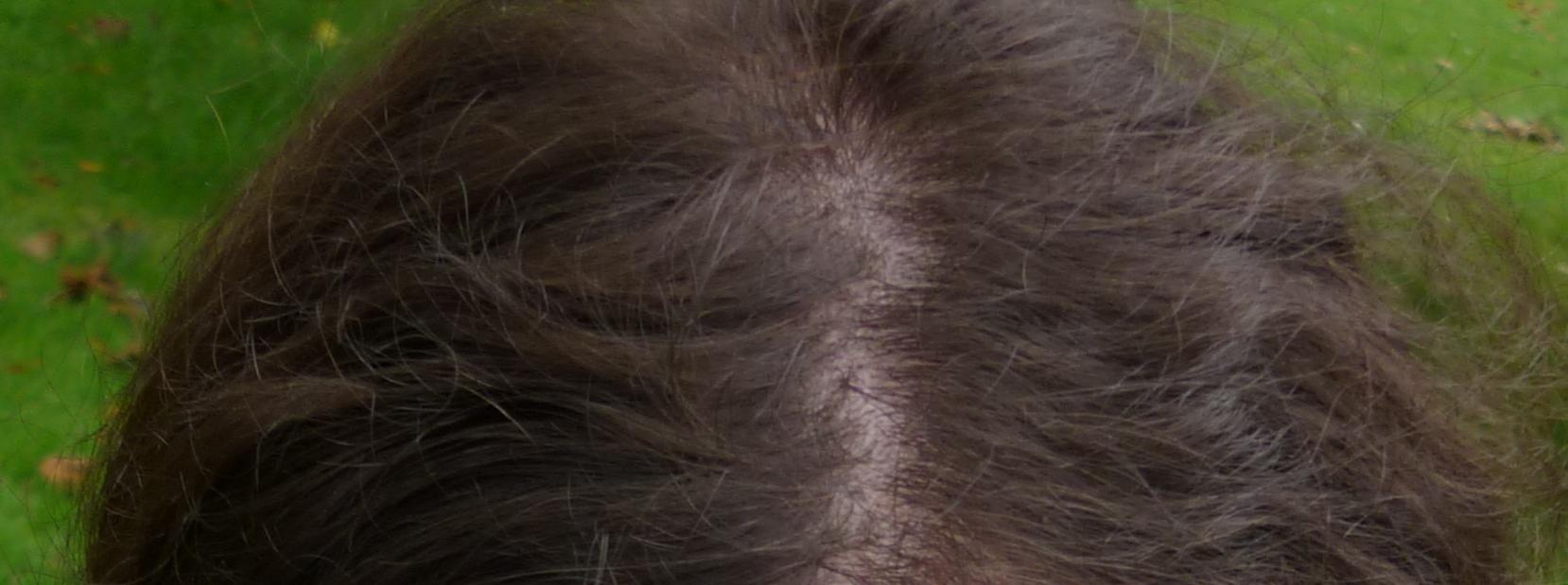 Unfortunately, the diffuse lose 'strip' (almost like the female variant of male pattern baldness, I've realised) is still quite visible in any kind of strong light. I do look odd as my hair is basically my 'Jewfro' thickness all round the sides and back, but very wispy and see-through on top, moreso than this photo really portrays.