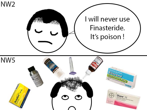 finasteride -> topical minoxidil+needling -> dutasteride -> oral minoxidil -> hair transplant or potential new drugs