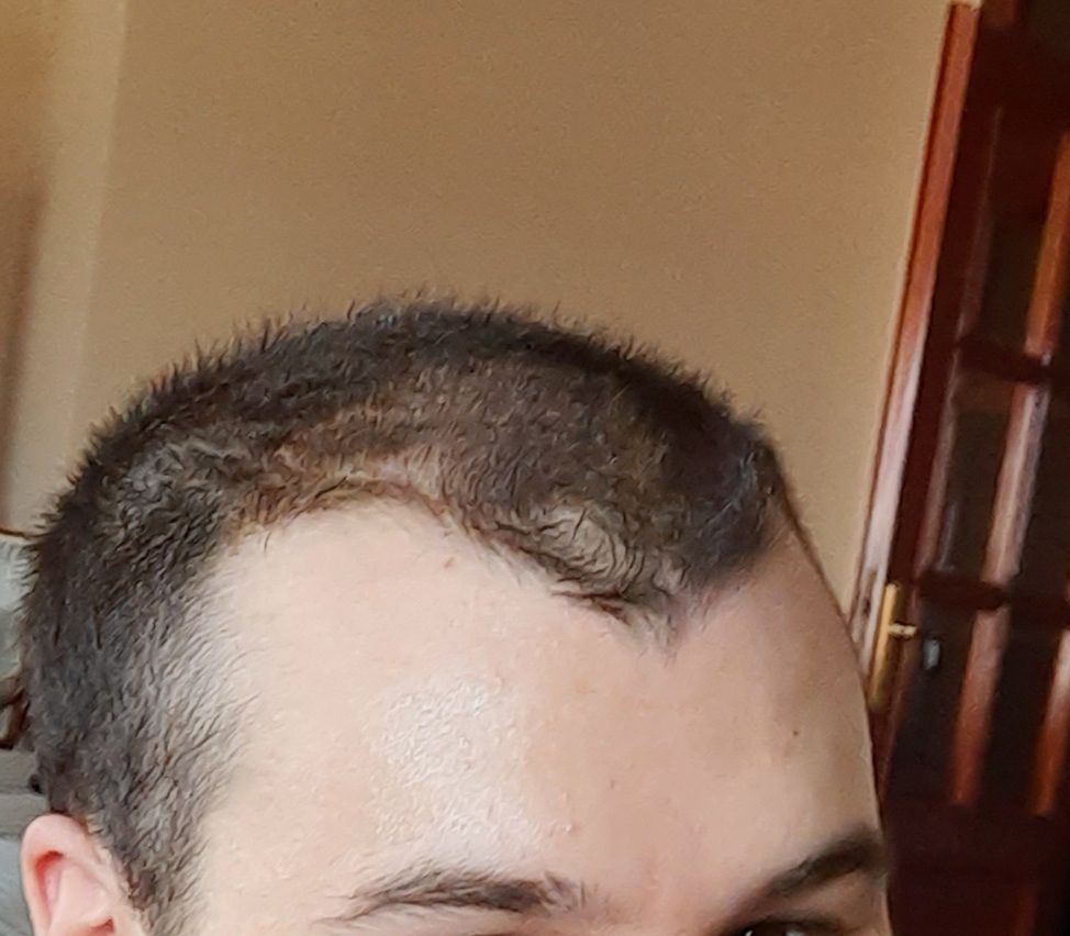 This pic shows my weird hairline. I have 2 cowlicks just above my widows peak. Somehow this area has survived the worst of it. The pic is a little misleading though as the lighting makes it seem as if I have more hair than I do (did.)