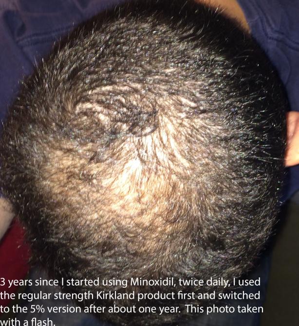 I took a picture on day 1 when I started using regular-strength Kirkland Minoxidil liquid, I was 33 years old when I started. After about 1 year, I switched to the 5% minoxidil liquid. I applied the minoxidil twice a day, 90% of the time (there were some stretches where I only applied it once a day, hence the 90% number).