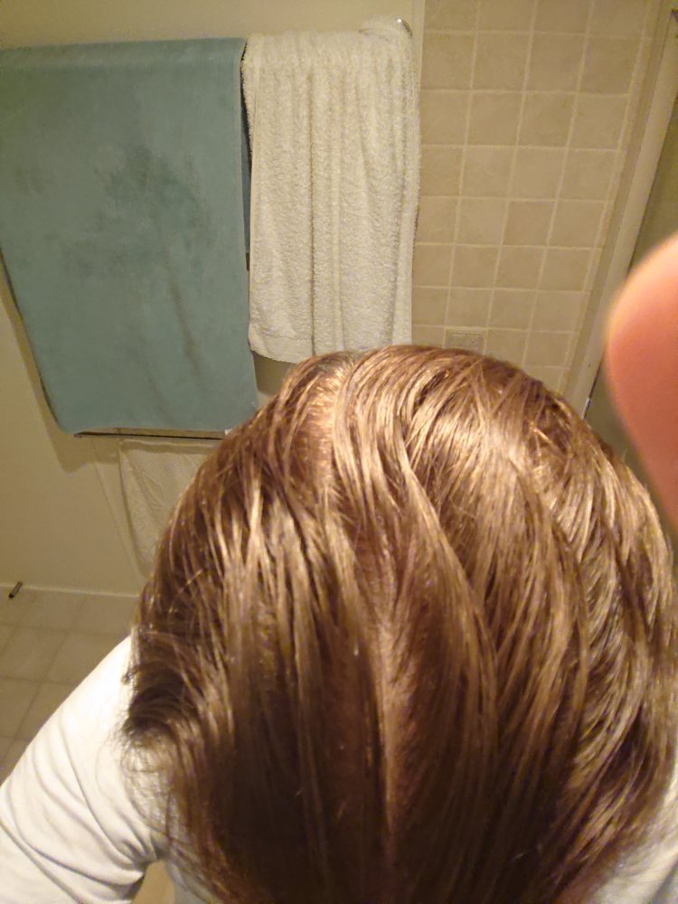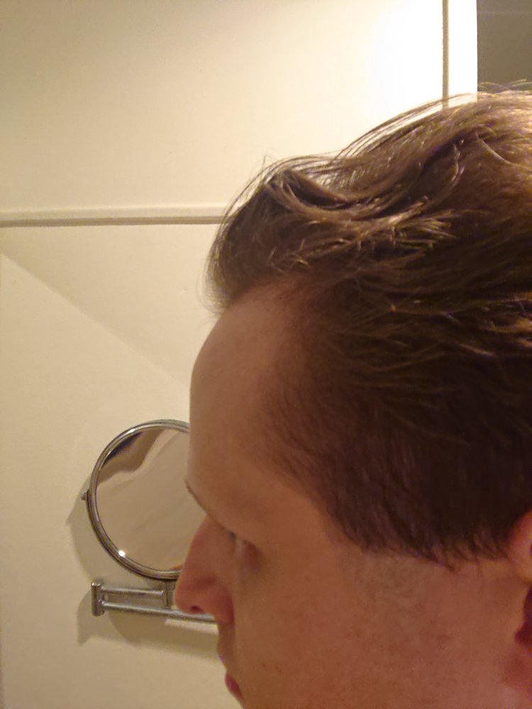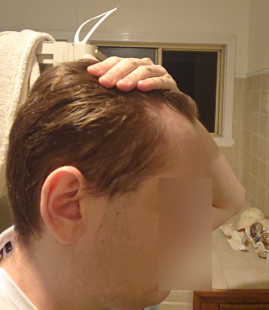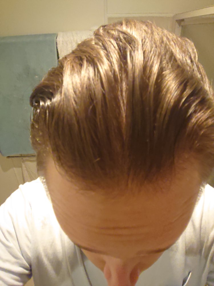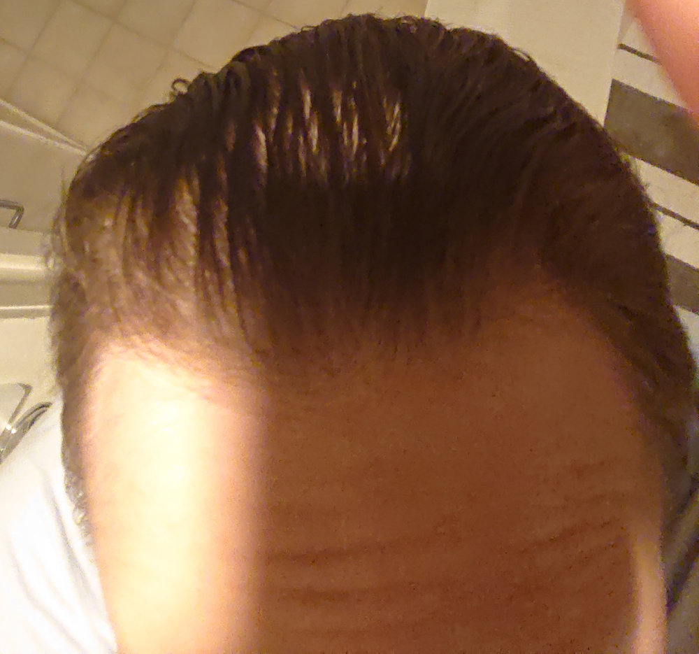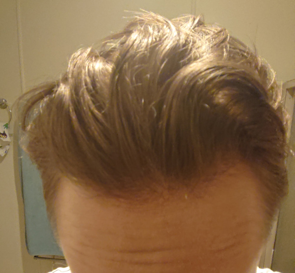 There don't seem to be any issues with my crown and my hairline seems to be intact, with a slight M curve. I do not have an itchy scalp and my hair is certainly not falling out in clumps, but I notice that I need to make a little more effort to style the right side of my hair than I used to.