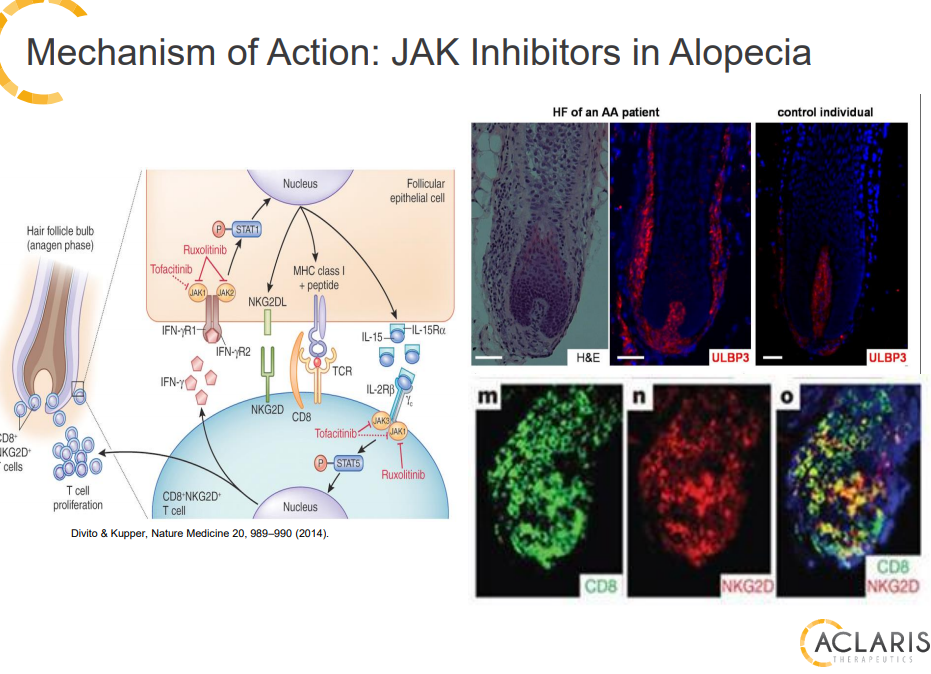 “(JAK-stat inhibition) results in rapid onset of anagen and subsequent hair growth. We show that JAK inhibition regulates the activation of key hair follicle populations such as the hair germ and improves the inductivity of cultured human dermal papilla cells by controlling a molecular signature enriched in intact, fully inductive dermal papillae.”