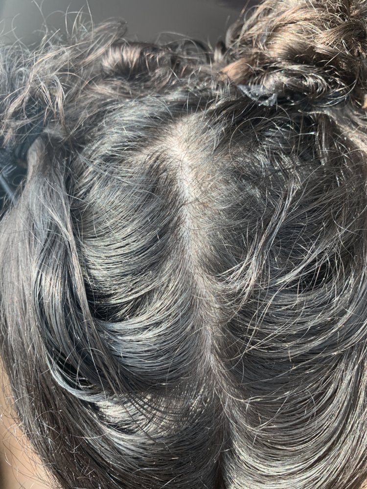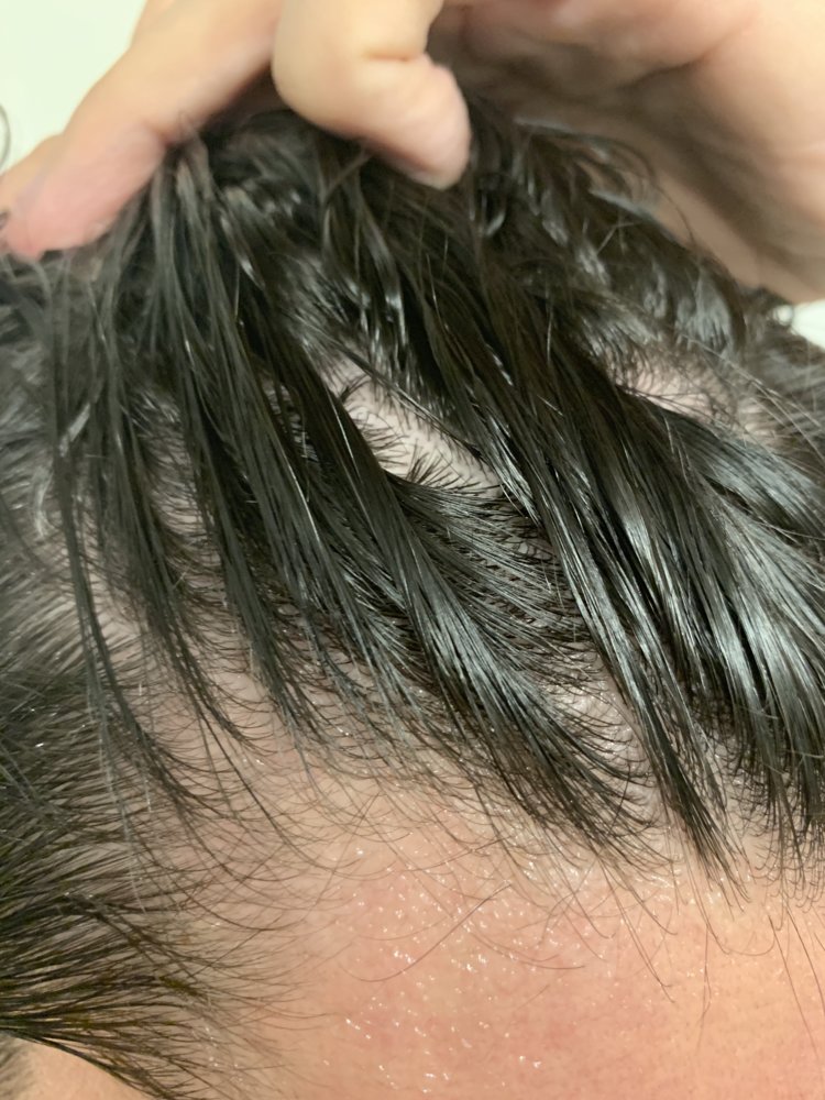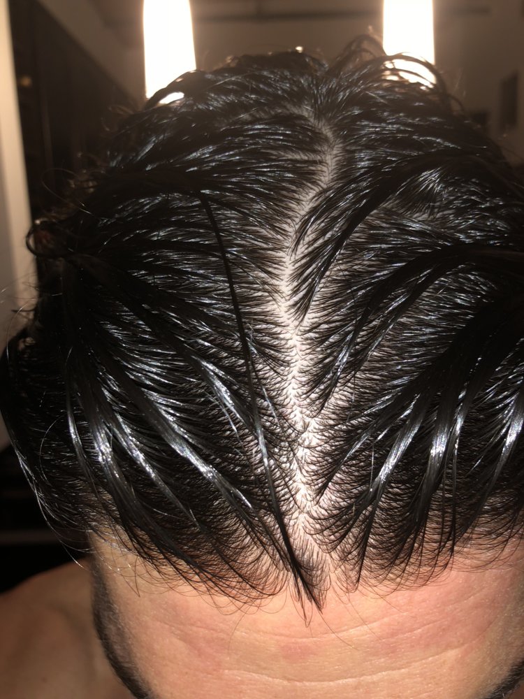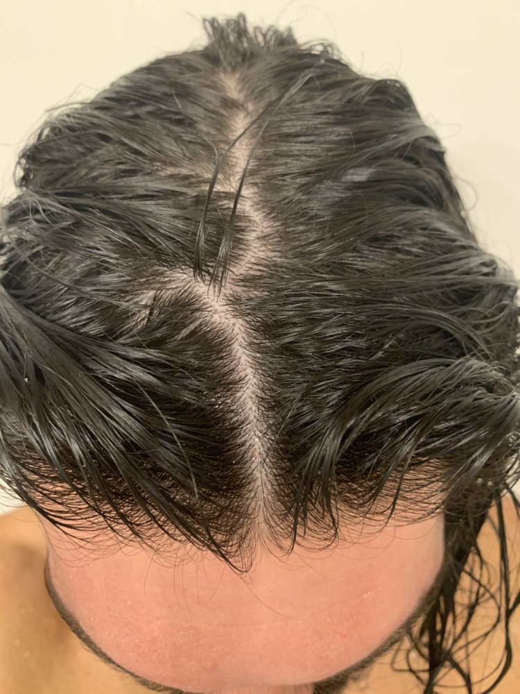Zero inflammation. Scalp is white and clean no sebum. Up close it's a weird weird mix of miniaturization and normal hair. Miniaturization on the sides as well.
