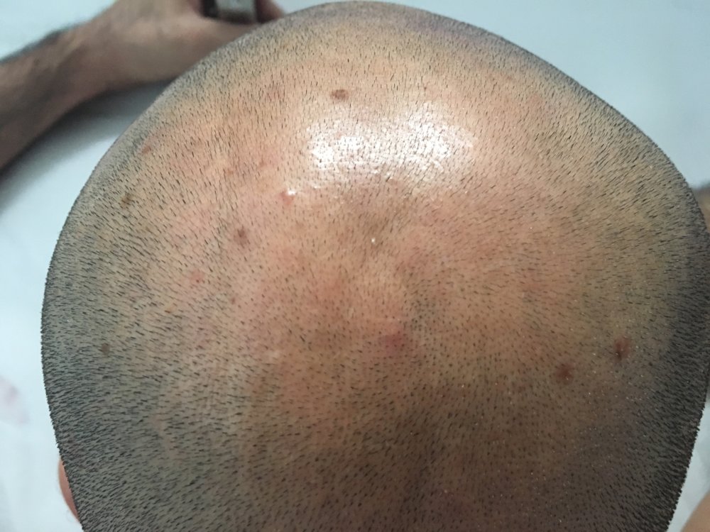 Scalp massage - rubber brush - 10-15 min / 3 days. At least helps remove excess dandruff - hoping for blood circulation. Application is a bit painful on the days right after buzz due to lack of hair. Also application is more painful on the crown / hairline due to no hair. Maybe also due to unhealthy scalp in those areas.