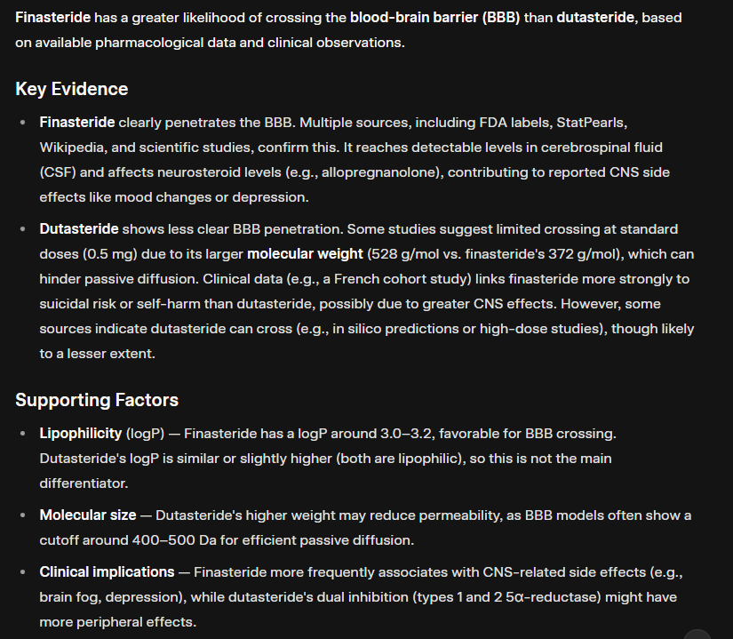 2ое отличие это то, что размер молекул дуты больше и ему сложнее преодолеть гематоэнцефалический барьер (грубо говоря сложнее попасть в мозг). Из за этого у него меньше шансов на побочки, связанные с изменением уровней нейростероидов, такие как депрессия, головная боль, тупость и прочее.