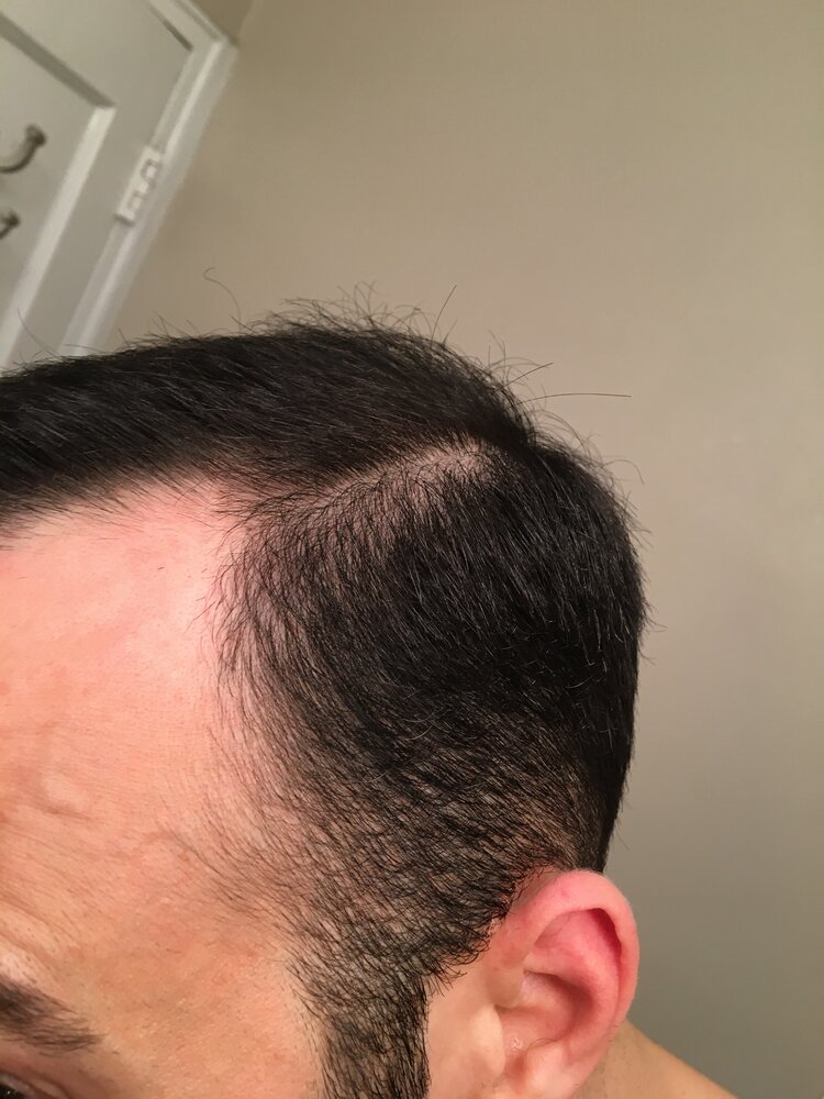 So I've been going through more hell with my hair loss lately. This time it's pretty scary considering I always thought I had strong sides that would one day make me an easier candidate for either a transplant or a hair system. I recently began noticing thinning in a certain area when coming out of the shower on each side of my head. The area appears to be the "Lateral humps" as they are called. Basically it's an area around the temples above the sides that I have noticed appears thin for many guys when they have their hair systems off, but sometimes they can be lost completely and can leave you with one of those horrific Larry David style horseshoes as opposed to just a basic horseshoe. I've read and have been told by a Doctor that sometimes they go completely and other times they just thin out. It does seem like these are the areas that would be lost much later in life though. Meanwhile I am only 36 years old. It should also be noted that just recently I also started dermarolling in a last ditch effort to try and strengthen my hair, and it has caused some serious shedding at the crown but I haven't done too much in this area, but I have a little. Below are pics of the hair dried and highlighted are the parts i'm talking about. Any thoughts??