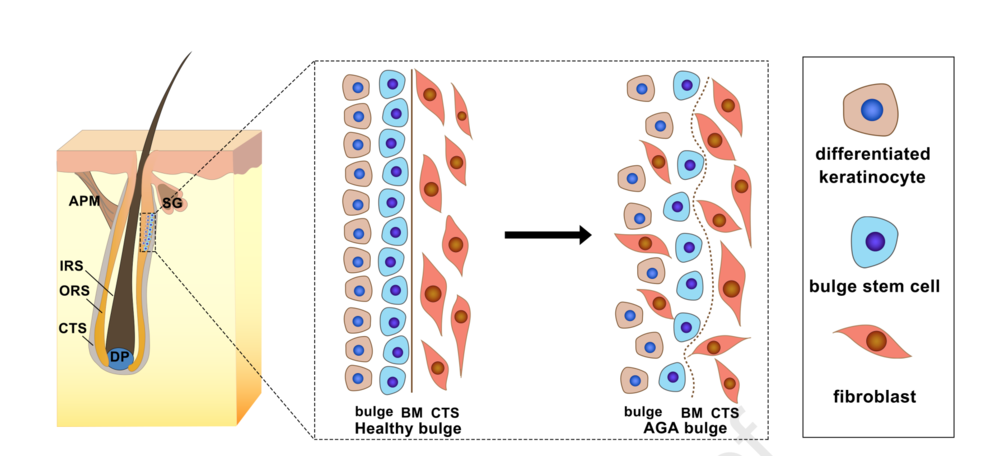 The paper is simple: They find evidence of fibrosis in the bulge of the follicle itself. They say that drugs that can act on fibrosis can hold promise for baldness.