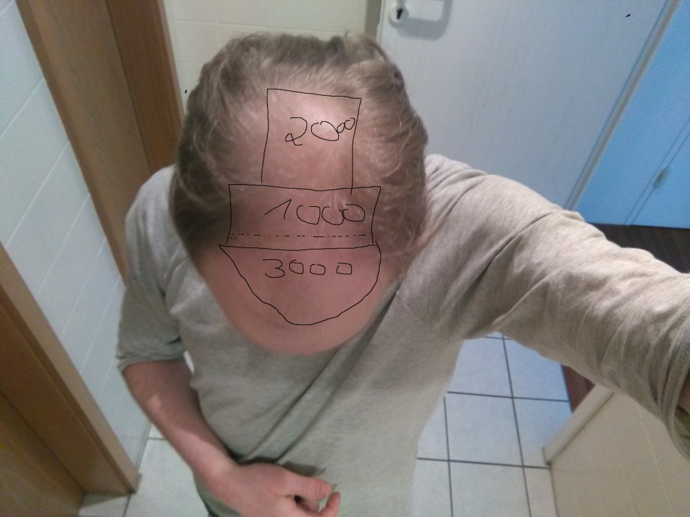 The Hairline with about 3000 Grafts and the middle with about 1000 Grafts.