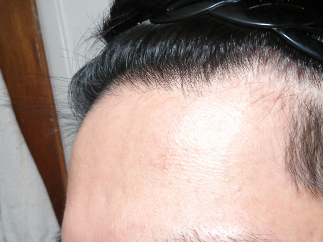 I've been taking quartered 1mg Finasteride tablets every day since the end of August, about 3 1/2 months now. I tried Rogaine foam for about a month, but I noticed that I had a puggish face whenever I smiled, so I discontinued it. So far the results are underwhelming - there's some regrowth poking out from within the hairline at the temples, and small, barely visible fuzz below it. The slight recession at the middle of my hairline is unchanged.