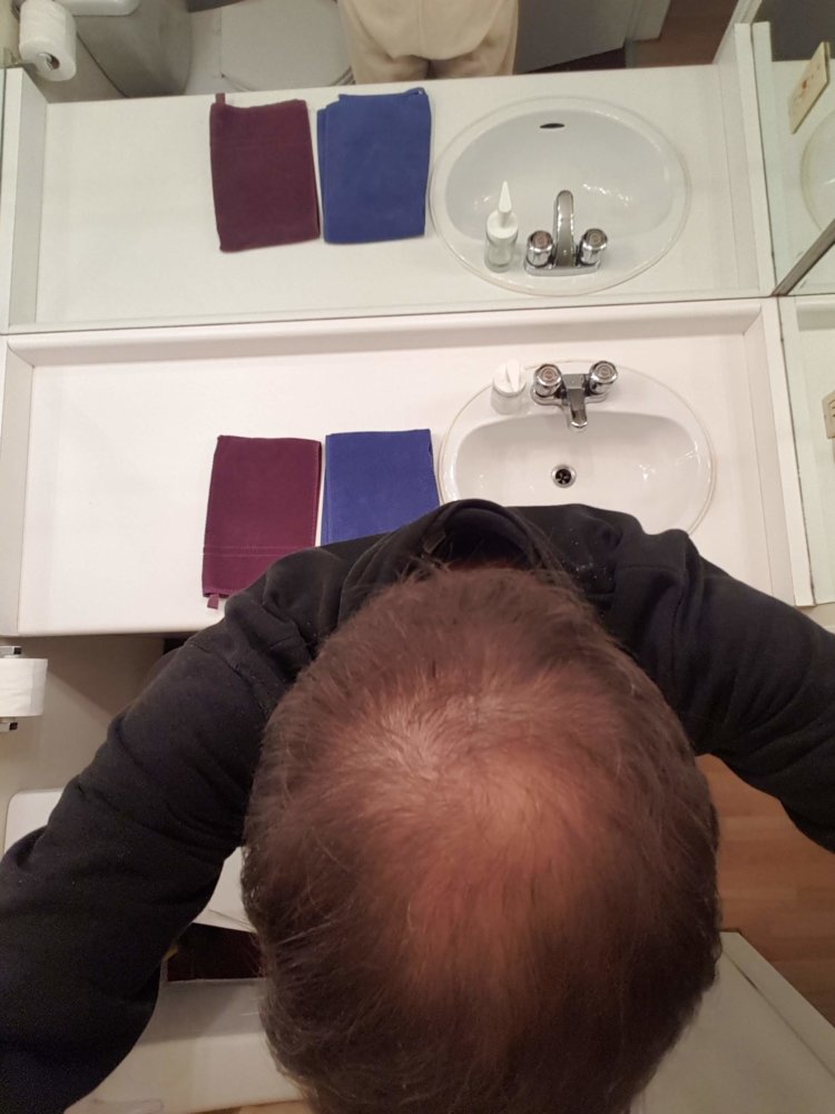 But now, either due to the hormone treatment, the low iron, or just the general shock of recovery, the crown of my head has lost more hair than ever before. I have been thinning on my crown for years now, but very, very slowly, in a way that I could accept. Once my blood levels get back up to normal, my hair usually gets thicker and I can hide it -- but not so anymore. I'm of Irish descent so my hair is naturally thin in the first place, but now it's REALLY thin back there. Also as you can see the corners of my hair line are receded, but that has also been happening for a long time. All the male cousins on my mother's side who are around my age or older have completely lost their hair, almost 100%. So I may be doomed. However, my dad's side shows no hair loss, and my father had none.