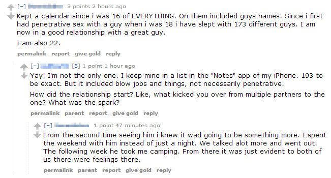 I don't mind if a woman has slept around a little bit - but anything over 50 would be a cause for concern.