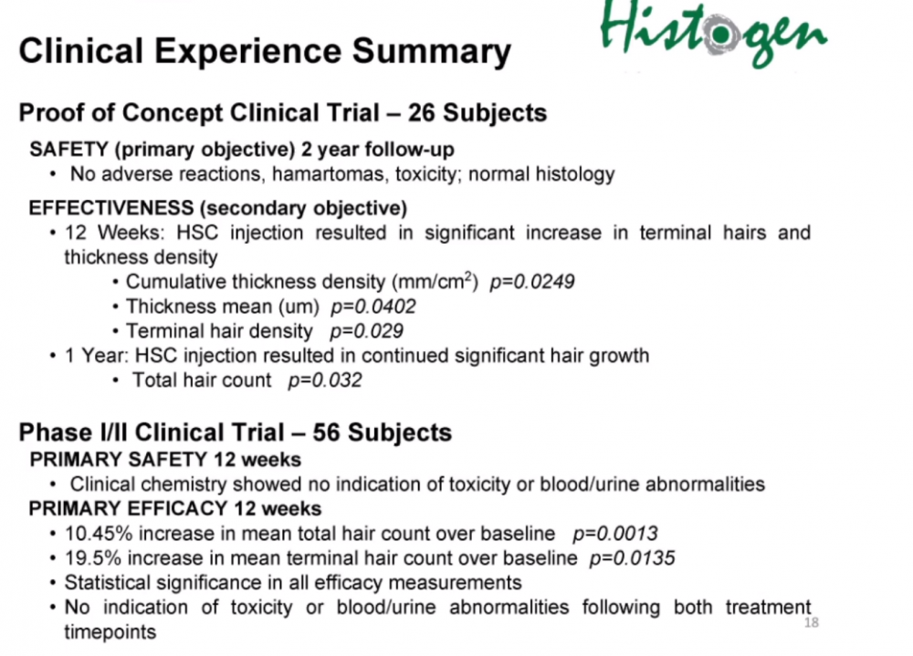 Now I would also like to address Histogen. I don't understand why people concentrated on th pictures when they should have concentrated on the Phase I/II trial results where you can see they have about 19% terminal hair increase after 3 months: