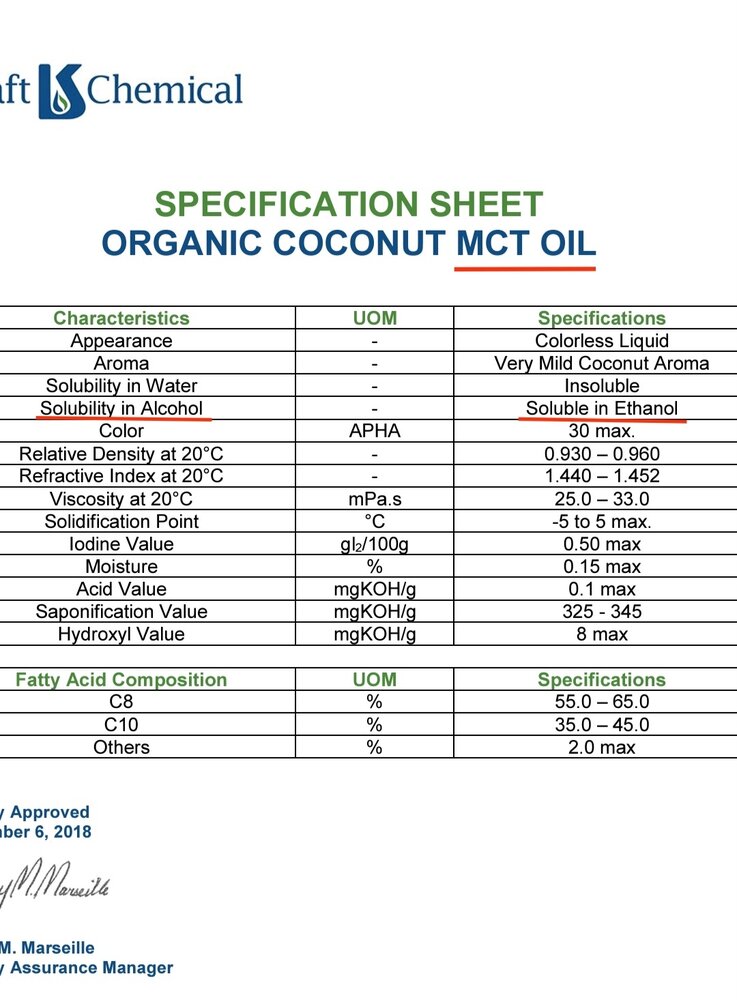 Also you shouldn't use other oils cause they are long chain fatty acid and your ethanol will precipitate. So please stick with MCT oil specifically and if you can, try to get MCT C8 only which would bring the best miscibility in alcohol