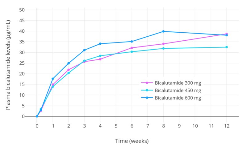 I think this is correct because: 'Bicalutamide requires 4 to 12 weeks (1 to 3 months) of continuous administration to reach steady state (maximal) levels. However, the accumulation of bicalutamide levels is logarithmic, and so most of the increase in concentrations happens rather quickly; about 50% occurs in the first week and 90% by 4 weeks.'