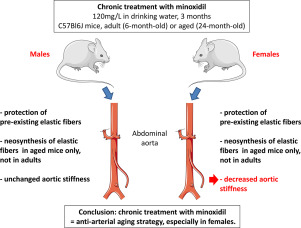 Minoxidil, an ATP-dependent K+ channel opener, has been shown to stimulate elastin expression in vitro and in vivo in the aorta of young adult hypertensive rats. Here, we have studied the effect of a 3-month chronic oral treatment with minoxidil (120 mg/L in drinking water) on the abdominal aorta structure and function in adult (6-month-old) and aged (24-month-old) male and female mice. Our results show that minoxidil treatment preserves elastic lamellae integrity, which is accompanied by the formation of newly synthesized elastic fibers in aged mice. This led to a generally decreased pulse pressure and a significant improvement of the arterial biomechanical properties in female mice, which present an increased distensibility and a decreased rigidity of the aorta. Our studies show that minoxidil treatment reversed some of the major adverse effects of arterial aging in mice and could be an interesting anti-arterial aging agent, also potentially usable for young female-targeted therapies."
